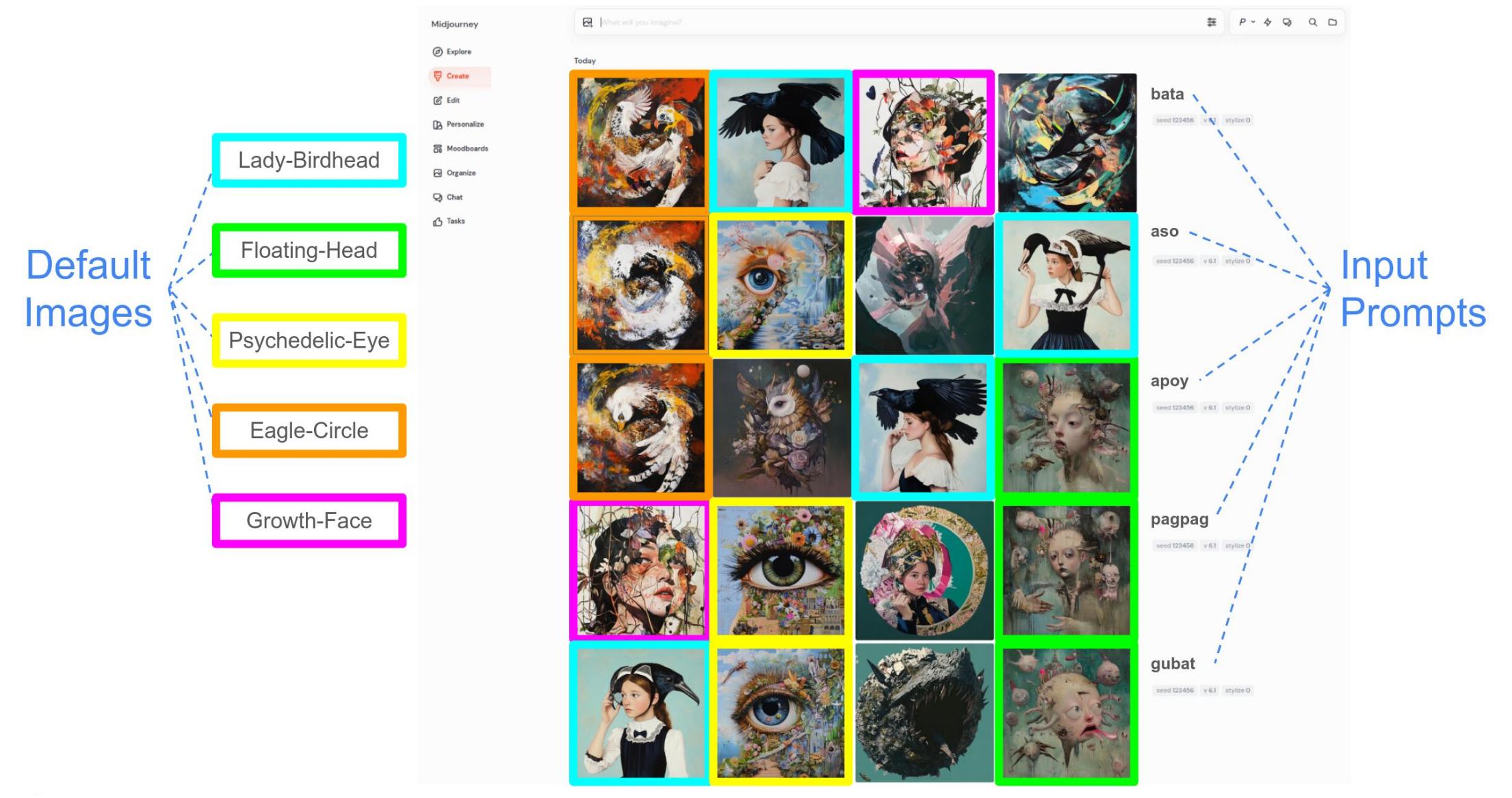Figure 1: Default images in Midjourney. Varied, seemingly unrelated prompts lead to visually similar outputs (the "default image"), motivating our exploration of this behavior in text-to-image generation models (Midjourney).